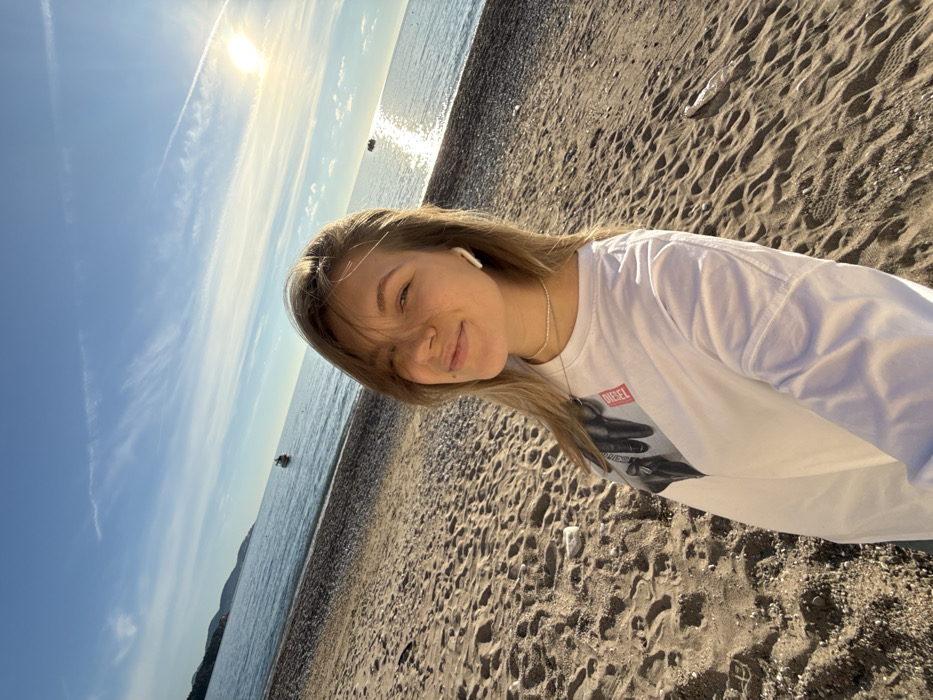 The image captures a female, appearing to be in her late teens or early twenties, standing on a beach in Sutomore, Montenegro, under a clear blue sky