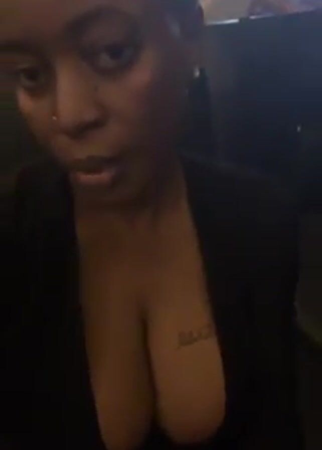 A dark-skinned woman is indoors, sitting with a seatback partially visible behind her. She wears a black top that reveals some cleavage and a small tattoo between her breasts. She is centered in the frame and looks into the camera, then picks up a wine glass filled with dark liquid and takes a sip. Upbeat music plays in the background.
