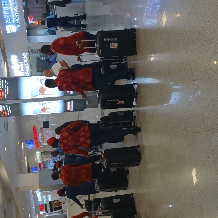 The image portrays an interior scene within what appears to be the Murtala Muhammed International Airport (MMIA) in Ikeja, Lagos, Nigeria. A group of approximately seven individuals, in the foreground and mid-ground, are uniformly dressed in red-orange patterned jackets over dark trousers, with some wearing matching red caps. Each individual in this group pushes one or two black, hard-shell rolling suitcases, moving generally from left to right across a polished, light-colored tiled floor that reflects overhead lighting. In the mid-ground, a male in a white polo shirt stands observing the group. Further to the right, a male in a dark blue uniform stands near a counter. Visible signage includes "KAYODE BUREAU DE CHANGE" with "CURRENCY EXCHANGE" directly below it, and "NET EXCHANGE." Two tall, illuminated vertical display panels bear "JAVA FURNITURE" branding, with one depicting a modern chair design. A partial "DBX" sign is also visible. The environment is brightly lit, indicative of a modern airport terminal. The primary action involves the uniformed group's coordinated movement with luggage, suggesting transit.