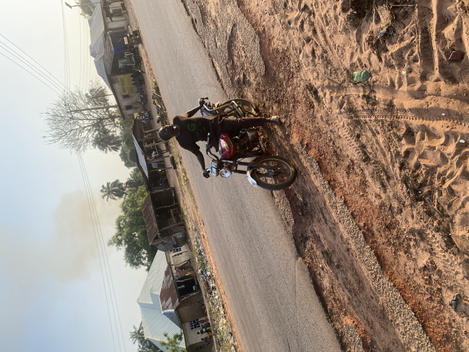 A man wearing a helmet is seated on a motorcycle with a red fuel tank, stopped on a paved road. To the left are buildings with corrugated metal roofs. Beyond the buildings are trees and a hazy sky. The road extends into the distance, while to the right of the motorcycle is a sandy area with tire tracks. A piece of green trash is visible in the sand.