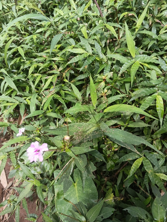 Lush green foliage dominates the scene, primarily composed of bamboo-like leaves. Interspersed are wider, textured leaves from other plants. A delicate pink flower stands out on the lower left, contrasting with the green. Some plants show seed heads with sparse clusters. The foreground reveals patches of soil and decaying leaves. The overall impression is one of dense, untamed greenery with varying plant species.