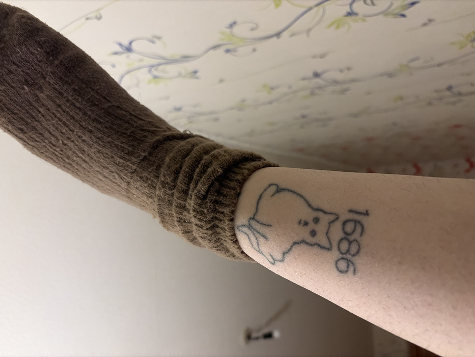 A person's arm is visible, adorned with a tattoo of a cartoonish cat and the numbers "1686" arranged vertically