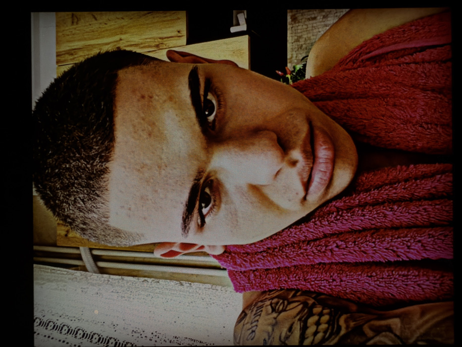 The image presents a close-up, headshot-style portrait of a young male individual, approximately 18-25 years old, looking directly into the camera. He has short, dark hair styled in a fade haircut. His facial features include dark eyes, prominent eyebrows, and visible blemishes (acne) on his forehead and cheeks. His lips are slightly pursed, conveying a serious expression. A textured, reddish-pink towel is draped around his neck and shoulders. A black ink tattoo with intricate design elements, possibly including text, is visible on his left upper arm and shoulder area. The background on the left shows a light-colored, possibly white or off-white, patterned curtain or fabric, partially obscuring a window or vertical structure. The background on the right reveals a warm-toned wooden surface, resembling cabinetry or wall paneling. Below the wooden surface, in the lower right, a small portion of a plant with green leaves and red flowers is visible. The lighting suggests an indoor setting. The specific location within the city of Sofia, Bulgaria, is not discernible from the visual information provided in the image.