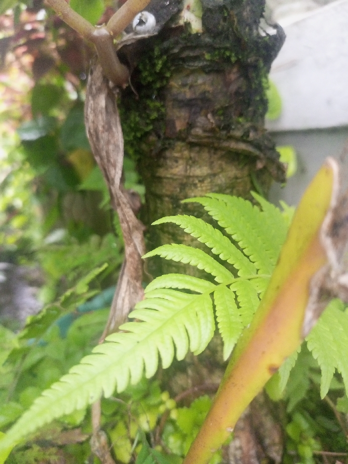 This image presents a detailed close-up of lush vegetation in Zee Pin Kone, Myanmar. A prominent, vibrant green fern frond with finely serrated pinnate leaflets dominates the lower-center and left portions of the frame. Behind it, a vertical tree trunk with textured bark, heavily encrusted with dark green moss and some lighter patches, is visible. Near the top of the mossy trunk, a small, white, irregularly shaped object or fragment is present. To the left of the tree trunk, a dried, elongated, brown leaf or stem hangs vertically. The right foreground is partially obscured by a blurred, out-of-focus yellowish-brown stem or leaf. The background consists of various diffused green plant elements, suggesting a dense, natural, and humid environment. No human subjects, animals, or discernible actions are depicted.