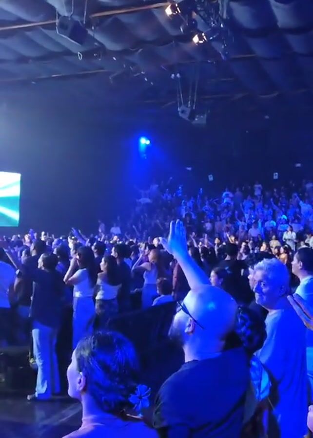 A large crowd of people are standing in a dimly lit venue, facing a stage. Most are standing with their arms raised. Stage lights create a blue hue across the scene. Above the crowd are visible ceiling fixtures and support beams. On the stage, a large screen displays what appears to be a live performance by a band. A song with Spanish lyrics is playing. The crowd's attention is focused on the stage, creating a sense of communal experience.