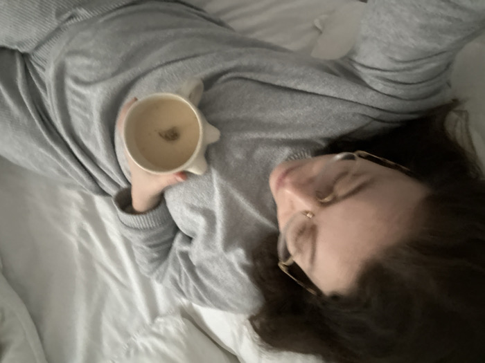 The scene is an indoor setting, likely a bed in a residential space within the city of Madrid, Spain. No specific architectural or geographical identifiers are present to pinpoint an exact location within the city. A single individual with dark hair and fair skin is depicted, lying down and viewed from an overhead perspective. The person wears gold-toned wire-frame eyeglasses and a grey long-sleeved garment, possibly loungewear. Their right hand holds a white mug with an irregular or decorative handle, containing a light brown liquid, possibly coffee or tea, with a small dark particulate floating on its surface. The individual's gaze is directed downwards, generally towards the mug. The environment consists predominantly of crumpled white bedding.