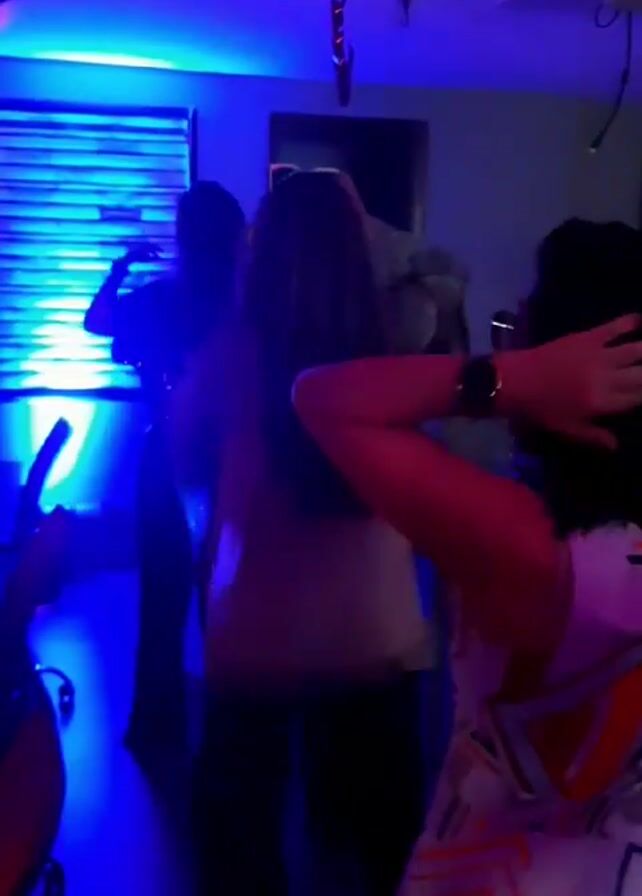 group of three people dancing in a room with disco lighting. The room is dimly lit with blue and red lights that cast shadows on the walls and ceiling. There are decorations hanging from the ceiling, and a window with blinds is visible in the background. One person is wearing a white tank top and black pants and has their back to the camera, while another person is wearing a patterned dress and glasses. The third person is mostly silhouetted. All three people are moving and dancing to the music.
