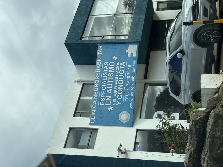 The image displays a two-story commercial building under an overcast sky. The building features a facade of white and dark teal/blue sections, with multiple windows reflecting the sky. A large, horizontal blue sign is affixed to the white section of the building, centered above the ground floor. The sign reads "CLINICA NEUROREHABILITAR" at the top, followed by "ESPECIALISTAS EN AUTISMO" (Specialists in Autism), and then "NEUROREHABILITACIÓN Y CONDUCTA" (Neurorehabilitation and Behavior). Below this, a phone number "TEL: 317 440 79 19" and a website "www.neurorehabilitar.com" are displayed. The sign includes various cartoonish icons related to space and education, a "neuro rehabilitar" logo with a brain on the left, and a "METODO TEA INTEGRATIVO" (Integrative TEA Method) logo on the right. To the left of the main entrance, a white CCTV camera is mounted on the wall, and a security sticker with "SEC" is visible on the glass of the door or window. Green foliage and a small cluster of roses are visible near the building's base. In the foreground, large rocks are present on the left, partially obscuring the base of the building. A silver Volkswagen Tiguan SUV is parked on the right, facing towards the left, with its front partially obscured by a yellow and black striped bollard. The scene is located in a city in Unknown, Colombia. No individuals are visible.