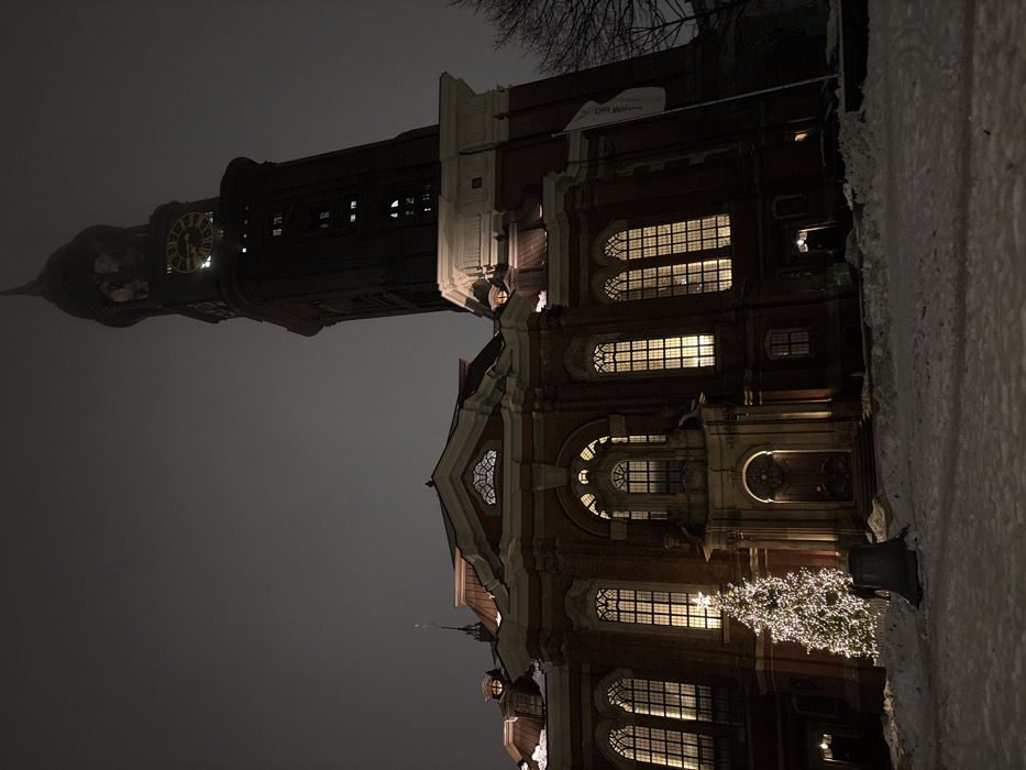 A tall, dark brick building with a clock tower dominates the left side, illuminated by the clock's face. Windows glow warmly, contrasting with the night sky. The architecture is ornate, featuring arched windows and decorative details. A lit Christmas tree stands in front of the building, adding a festive touch. The right side has a visible snow, suggesting a winter scene. The overall image evokes a sense of grandeur.