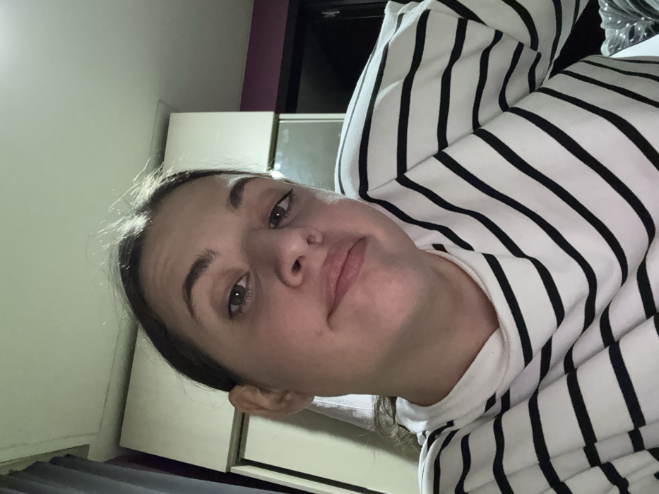 The image features a close-up, head-and-shoulders selfie of a single individual, a female, indoors. She has light-brown hair pulled back, brown eyes, and is looking directly at the camera with a neutral expression, exhibiting a slight upward curve at the corners of her lips and a minor furrow in her brow. She is wearing a long-sleeved crew-neck shirt with a pattern of white and black horizontal stripes. The background is an interior space, indistinct but suggesting a domestic or private setting. To the subject's left, a light-colored curtain, possibly grey or beige, is visible, partially obscured by what appears to be a light-colored wooden wardrobe or cabinet. To the subject's right, a white wall or piece of furniture is present, behind which a section of a dark purple or magenta-colored wall is visible, along with a dark rectangular shape that suggests a window or doorway in a dimly lit area. The lighting appears to be artificial, originating from above and slightly in front of the subject. There are no visual cues within the image to specify a location in the city of Tbilisi, Georgia.