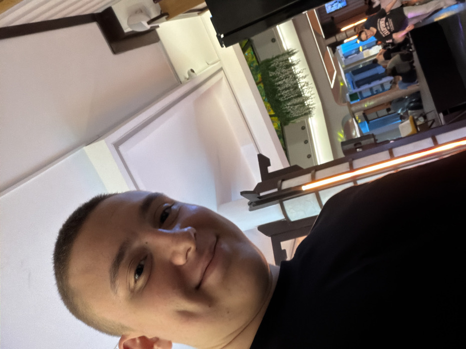 The image depicts an indoor scene in Ravda, Bulgaria, captured from a low angle. The primary subject is a young male, positioned in the left foreground, looking directly at the camera with a slight smile and visible dimples. He has very short, dark hair and wears a dark-colored shirt. The background reveals a large, modern interior space, likely a commercial establishment such as a hotel lobby or restaurant. A multi-layered white ceiling occupies the upper portion of the frame. To the right of the primary subject, a decorative vertical pillar features integrated orange-glowing light strips and a dark, possibly wooden, structural framework. Above and behind this pillar, a section of ceiling or wall includes a suspended arrangement of artificial greenery. Further into the background, other individuals are visible. One person on the far right walks towards the left, wearing a black t-shirt with "CALIFORNIA" text, light-colored pants, and eyeglasses. Multiple other indistinct figures are present in the deeper background, some appearing to be seated or gathered. Elements of the interior include bright ambient lighting, possibly blue or green light sources in the distance, and blurred furniture, including a distinct yellow chair. A large, dark, rectangular object, possibly a counter or speaker, frames the lower right edge of the image.
