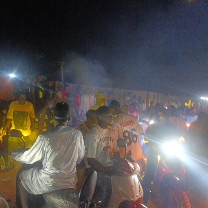 A crowd of people, mostly dark-skinned, is illuminated by the headlights of several motorcycles. The scene appears to be at night with a fence in the background. Some individuals are wearing white and yellow shirts. One person is wearing an orange jersey with the number 86. The image is a bit grainy.