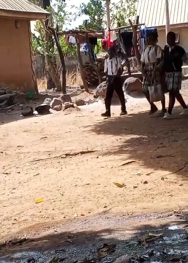 A short video clip shows three people walking away from the camera along a sandy path in a rural setting. The people appear to be students, dressed in school uniforms with plaid skirts, white shirts, and black vests. One carries a bag. The path is bordered by buildings, one a simple structure with a light-colored wall and the other a house with a tin roof. A clothesline strung between wooden posts is visible in the background, with various items of clothing hanging on it. The ground is sandy and littered with debris, with some burned material near the bottom of the frame. Trees cast shadows on the scene, suggesting a sunny day. The students are walking at a normal pace, seemingly engaged in conversation.