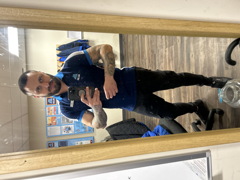A male individual is depicted taking a mirror selfie within an ALDI staff room, identified as being in Lancaster, United Kingdom. The man has short dark hair, a beard, and visible tattoos on both forearms. He is wearing a dark blue ALDI polo shirt with white and light blue trim, featuring the ALDI logo and text on the chest, along with a nametag on his left side. He also wears black cargo pants and black athletic shoes. His right hand holds a smartphone with a circular grip accessory, pointed towards the mirror. The reflected background reveals a functional staff area with light-colored walls and wood-patterned laminate flooring. On the left wall, several ALDI-branded informational posters are displayed. To the right, a rack holds multiple blue uniform jackets. A portion of a black office chair and a clear plastic jug are visible on the floor in the lower part of the frame.