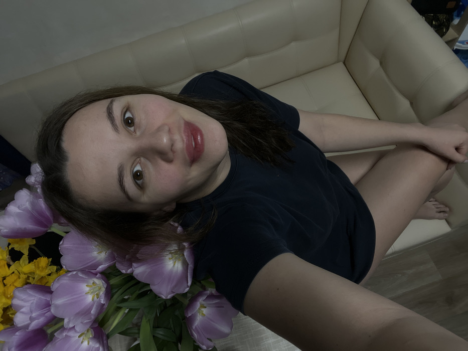 This image depicts a female individual indoors, presumably in the city of Leninakan, Russia. The subject, a young adult female with brown hair and fair complexion, is centrally positioned, looking directly at the camera with wide-open eyes and slightly parted, glossed lips. She is wearing a dark-colored, short-sleeved t-shirt; her bare legs and feet are visible, with her left hand resting on her thigh. To the left and partially behind her is a large bouquet of light purple tulips interspersed with yellow flowers and green foliage. To her right, a section of a light-colored, possibly beige, upholstered sofa or bench with distinct horizontal seams is visible. The floor beneath her appears to be a light-toned laminate or wood. The scene is illuminated by ambient indoor light.