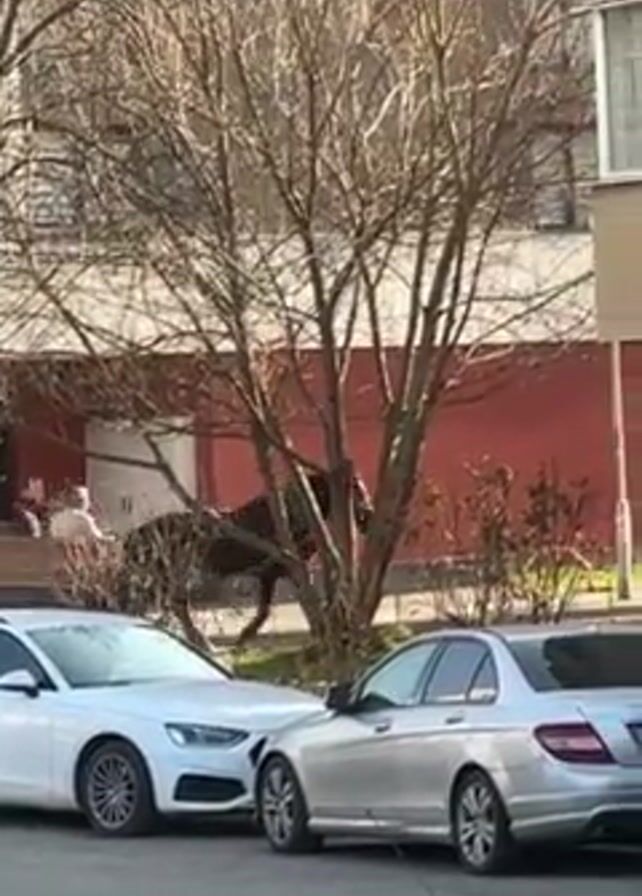black horse pulling a wagon on a city street. The horse is dark in color and pulling a cart or wagon of some kind. The cart is dark and somewhat obscured by the branches of a bare tree. A person is seen in the wagon. The scene takes place on a city street with several parked cars, including a white Audi and a silver Mercedes. A bus passes by on the right. A light-colored building is in the background. The trees are bare, suggesting it is autumn or winter.