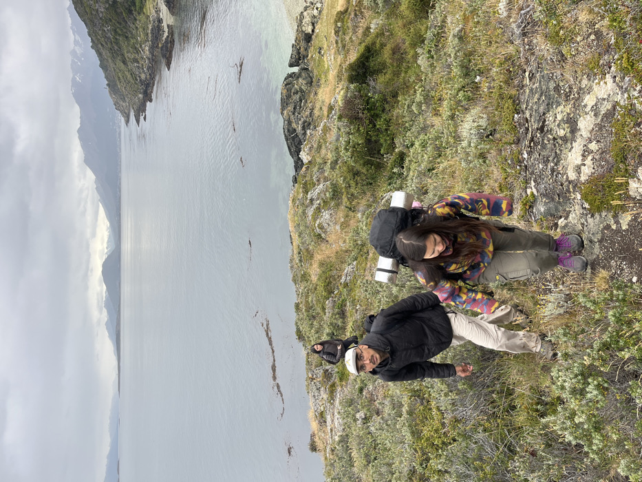 Three people are hiking along a grassy hillside. A woman with a backpack and colorful jacket is looking up towards the camera. A man in a black jacket and light-colored pants is looking down. In the background, another woman stands on the edge of the hillside. A large body of water stretches into the distance under a cloudy sky. Hills and mountains line the distant shore.