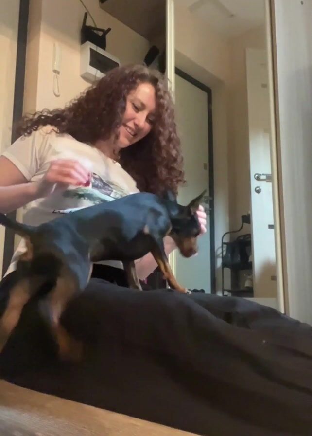 A woman with long curly hair is sitting on the floor in a room. She is wearing a white t-shirt and black pants. She is holding a small black and tan dog in her lap and petting it. The dog is standing on its hind legs, reaching up towards the woman's face. There is a wardrobe with mirrored doors in the background. The room is fairly tidy with a light-colored wood floor.