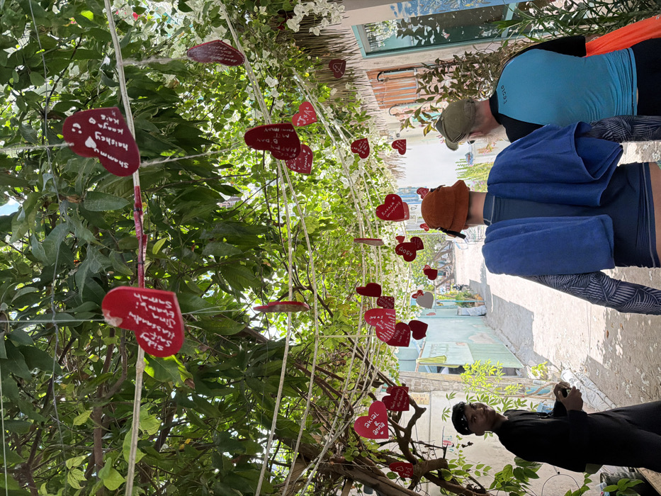 The image depicts a narrow pedestrian alleyway in Gulhi, Maldives, partially shaded by an overhead canopy of dense green foliage and white flowering vines. Numerous red, heart-shaped plaques, some inscribed with names such as "Sajay & Sifiy," "Akmal & Anna," and "Shamna & Haishay," are suspended at various heights from wires strung across the alley. Buildings with facades painted in light blue, white, and light green line both sides of the path. In the foreground left, a male individual, dressed in a black long-sleeved shirt and black trousers, with a dark bandana, stands facing the camera with a slight smile. He holds a small, dark object in his left hand. Two other adult males are observed from behind, walking away from the camera into the alley. The male on the left wears a brown bucket hat, a dark-colored long-sleeved rash guard, and has a blue towel draped over his shoulders. The male on the right wears a green baseball cap, a light blue long-sleeved rash guard with black shoulders, and carries an orange item in his right hand. The path surface appears to be a light-colored, unpaved material, extending towards a brighter, more open area at the alley's distant end. Clotheslines are visible against the building on the left.