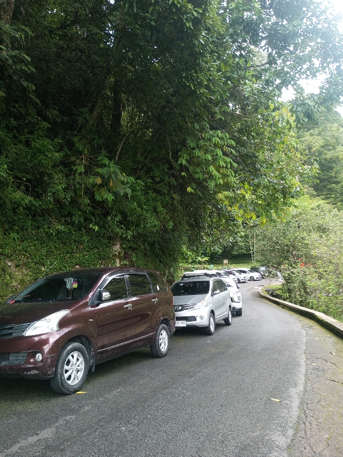 The scene displays a paved asphalt road curving to the right, bordered on the left by a steep, densely vegetated slope covered in mature trees and undergrowth. A low concrete barrier or curb defines the right edge of the road, beyond which more varied green foliage is visible. A line of vehicles is parked along the right side of the road, extending into the curve. In the immediate foreground, a dark brown minivan, consistent with a Toyota Avanza, is parked parallel to the vegetation. Directly behind it is a silver minivan, also appearing to be a Toyota Avanza, equipped with a black roof rack. Its front license plate is partially visible, displaying the alphanumeric sequence "P. 737 335". Further down the road, at least five more minivans, predominantly white or light-colored, are parked in a continuous queue. No individuals are visible. The lighting is diffused, indicating an overcast sky or dense tree canopy. The license plate format "P. 737 335" is inconsistent with Indian registration plates. Therefore, the location cannot be confirmed as Kanand, India, based on the forensic evidence within the image.