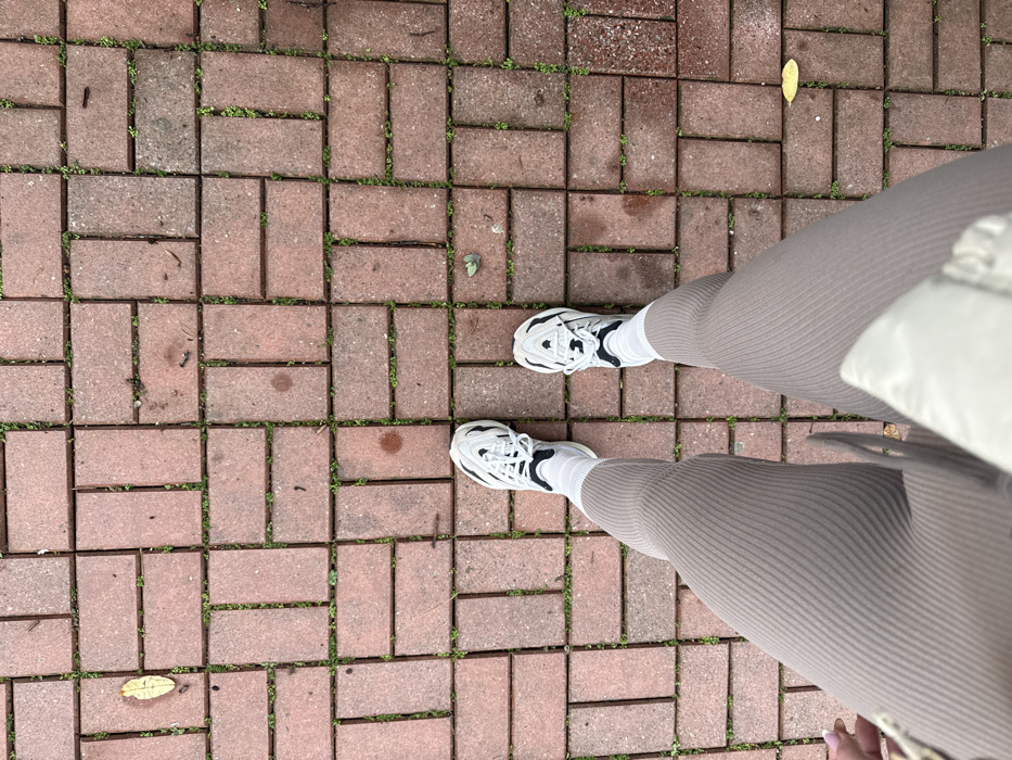 An overhead perspective captures the lower half of an individual standing on a brick paver surface in Petrovac na Moru, Montenegro. The pavement consists of reddish-brown rectangular pavers arranged in a repeating pattern, with green plant growth (likely grass or weeds) visible within the grout lines and gaps. Several light brown or yellow fallen leaves are scattered on the surface. The individual is wearing light taupe-colored, ribbed leggings, white ankle-length socks, and white athletic shoes with black trim and multi-textured soles. Both feet are positioned parallel to each other, slightly apart. The overall environment suggests an outdoor pedestrian area.