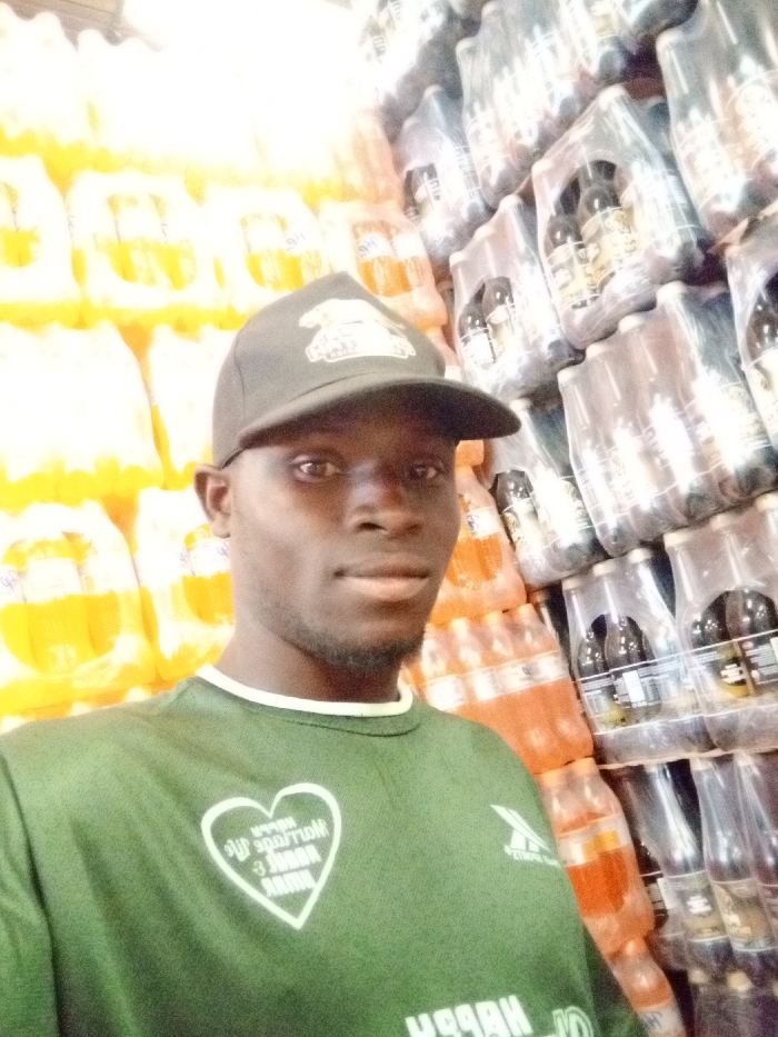 An adult male with dark skin and a neatly trimmed beard is positioned centrally, directly facing the camera with a neutral expression. He wears a dark green t-shirt with a white collar, featuring a white heart graphic on the left chest containing inverted text ("Happy Marriage Life" and names "JUMA'A & RAMAT"), and a white logo on the right chest. He also wears a dark baseball cap with a light-colored emblem on the front. The background consists of vertically stacked, commercially packaged beverages. To the subject's left, clear plastic bottles containing a yellow-orange liquid are bundled in transparent plastic wraps, forming a bright wall of product. To the subject's right, similar clear plastic bottles containing a dark brown liquid are similarly bundled and stacked, forming a contrasting wall of darker beverages. The setting is an indoor commercial beverage storage or retail area, reportedly located in Fagge A, Nigeria.