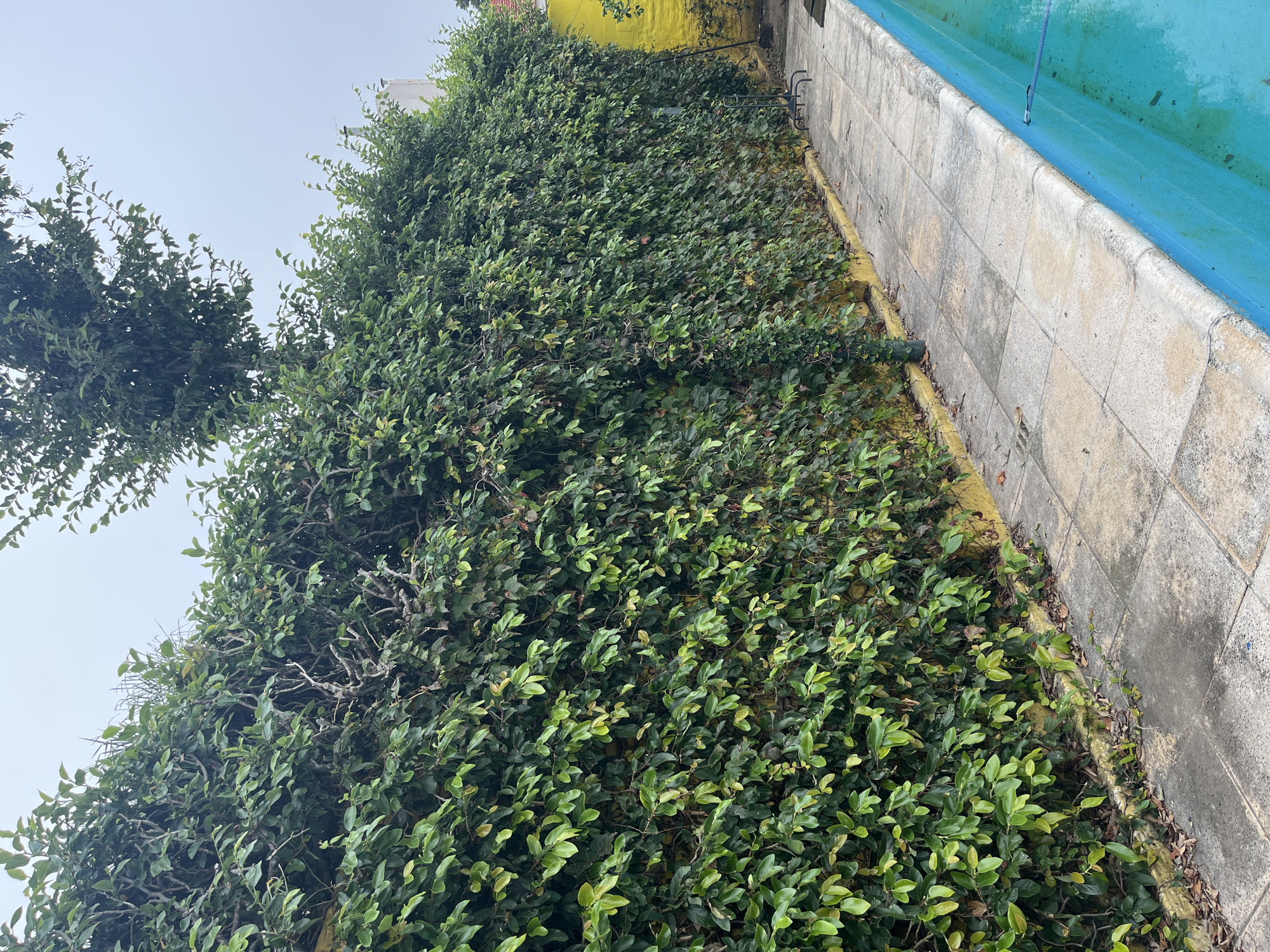 This image depicts an outdoor residential backyard in Cordoba, Argentina, under an overcast sky. A dense green hedge, approximately 2.5 meters tall, extends horizontally across the frame, covering a yellow wall. The hedge consists of numerous small, ovate green leaves, with some areas showing lighter green foliage and visible bare branches underneath the dense leaf cover. At the base of the hedge, a narrow strip of yellow wall is visible, along with scattered dry leaves on the ground. Adjacent to the hedge is a paved patio area composed of square, light-colored concrete tiles showing signs of weathering and discoloration. A light blue swimming pool with turquoise water occupies the foreground on the right side. A blue flexible hose is partially submerged in the pool water, extending from the left edge of the pool. On the patio, near the right side of the hedge, a black metal stand, possibly a clothes drying rack or grill stand, is present. A taller tree with green leaves is visible above the hedge in the upper-left quadrant, and a white building structure with a vertical pipe or chimney is visible above the hedge towards the upper-right. No individuals or active interactions are depicted.