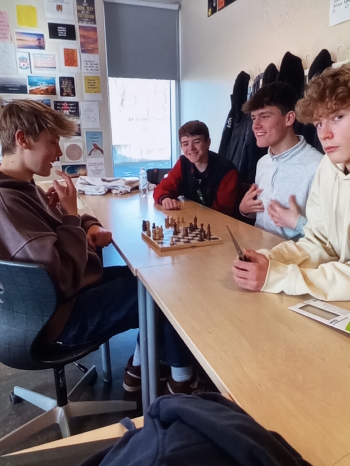 An indoor scene in Mrozów, Poland, depicts four young males seated at two conjoined light-colored tables. On the left, a male with blond hair, wearing a dark brown hoodie and dark pants, sits in a black ergonomic chair; his right index finger is raised, and his mouth is open, as he faces the center of the table. To his right, a male in a red and black varsity-style jacket smiles, looking towards the left. Next, a male in a light grey zippered sweatshirt gestures with both hands while smiling. On the far right, a male with curly blond hair, wearing a light-colored hoodie, holds a dark-handled folding knife with an exposed blade in his right hand, resting it on the table; his gaze is directed towards the viewer. A wooden chessboard with scattered pieces and a clear plastic water bottle are centrally placed on the table. The background features a light-colored wall adorned with numerous papers and posters, and a large window offering an outdoor view. Dark garments hang on a rack positioned to the right. The individuals appear to be engaged in a social interaction.