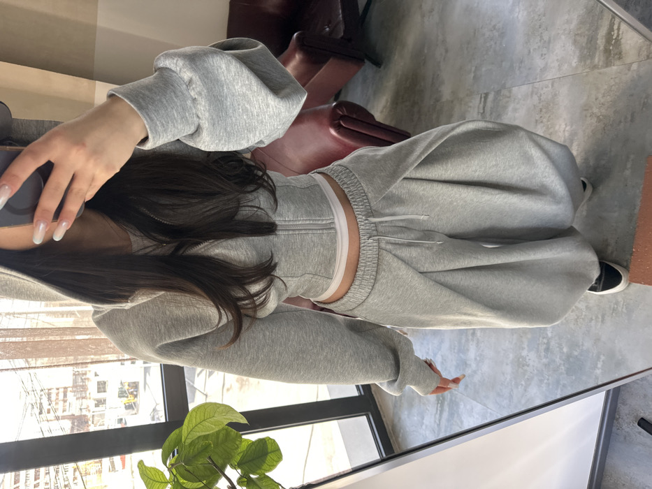 An individual, presumably female, is captured taking a mirror selfie indoors in Zovuni, Armenia. The subject's face is obscured by a dark-colored smartphone held in the right hand, which displays long, manicured fingernails with light-colored polish. Long, dark hair frames the subject's shoulders. The individual wears a light gray two-piece tracksuit featuring a cropped, hooded, zippered top with a fitted bodice and voluminous sleeves, along with baggy, draped sweatpants that have a visible drawstring. A white band is visible between the top and the pants. Dark-colored flat shoes are worn. The interior setting includes a light gray floor and a large, dark-framed window on the left. Beyond the window, a street scene is visible, depicting a yellow construction vehicle, buildings, and sparse vegetation under daylight. A green potted plant with large leaves is positioned near the window. On the right, a dark red leather armchair with a rounded back is partially visible.