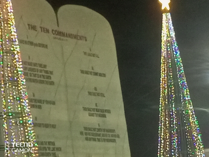 The scene presents a night-time view of outdoor Christmas decorations. A large monument displaying "The Ten Commandments" stands next to two tall, conical Christmas trees. The trees are lit with multicolored lights, and one has a star atop it. The background is a dark night sky. The overall scene suggests a public display combining religious and holiday themes.