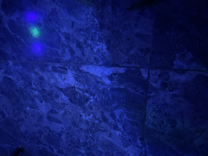 close-up view of a dark, possibly blue-toned, tiled floor. The tiles have a mottled, marbled texture. Three circular lights are visible in the upper left, two blue and one green. They could be emanating from a small device. The overall lighting is dim, contributing to a dark and slightly mysterious atmosphere.