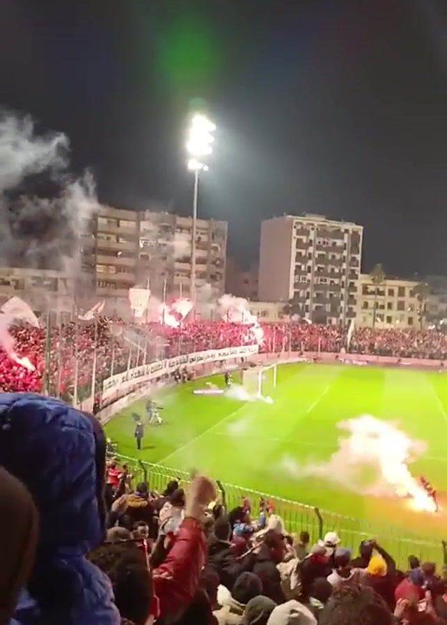 A video captures a lively soccer stadium at night. The crowd, clad predominantly in red, is visible from behind. Some spectators are wearing hats and hooded jackets. The green field is lit by stadium lights and obscured by smoke from flares. Buildings can be seen in the background. There is a general atmosphere of excitement.