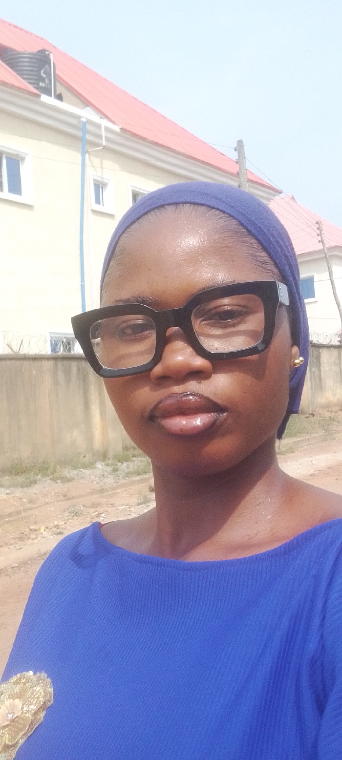 A dark-skinned individual, likely female, is depicted in a close-up, head-and-shoulders portrait outdoors. She wears a blue headscarf or bandana, large black-framed glasses, and a blue boat-neck top with a gold, sequined, and floral embellishment on the left chest. Her lips are full and appear glossy. A small gold stud earring is visible on her right ear. The lighting suggests a bright, sunny day, with visible sheen on her forehead and collarbone. The background reveals a street or unpaved pathway with light-colored dirt. Behind the individual, a beige or cream-colored building with a red sloped roof is visible. The building features white-framed windows. A black water tank is situated on the roofline to the upper left. A concrete fence topped with barbed wire runs along the property boundary. To the upper right, a wooden utility pole with wires extends into the light blue, clear sky. The scene depicts an urban residential environment consistent with many areas in Nigeria, but specific markers to pinpoint the exact location within Lokoja are not present in the image.