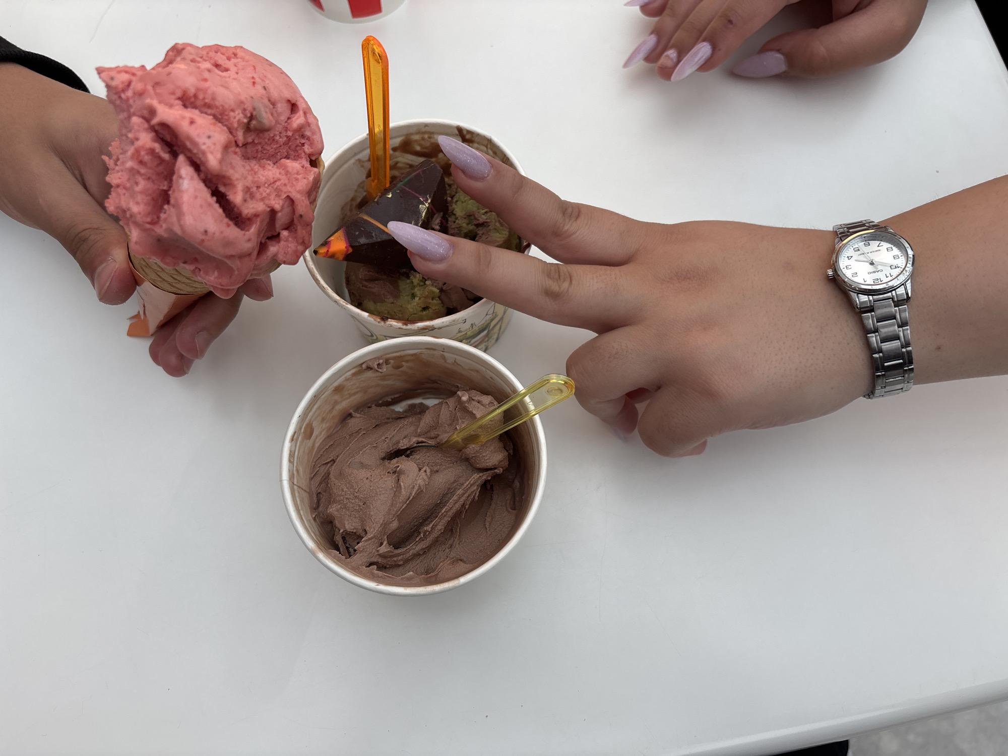 On a white table, three containers of ice cream are positioned. One container holds pink ice cream in a cone, held by a hand. The second container contains green and brown ice cream, with a chocolate piece, being touched by a hand with long lavender nails. A third container holds brown ice cream with a small yellow spoon. A silver wristwatch is worn on the wrist of the hand with lavender nails. The location of the scene is in the city of Unknown, Unknown.