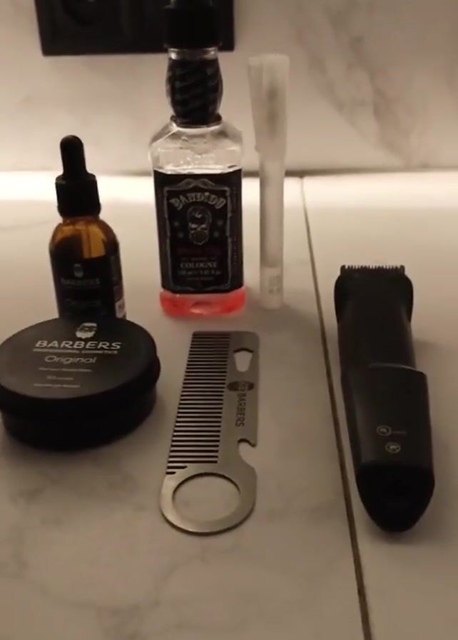 man in a bathroom. The first shot is a countertop with a collection of grooming products: beard oil, beard balm, cologne in a whiskey bottle-shaped container, a small bottle, a comb, and an electric beard trimmer. The camera then moves to a mirror, revealing a man with a beard. He is holding a silver smartphone and looks at himself in the mirror. He smiles and appears satisfied with his grooming routine. He has a ring on his left ring finger and some tattoos on his arm. The bathroom has white tiled walls.