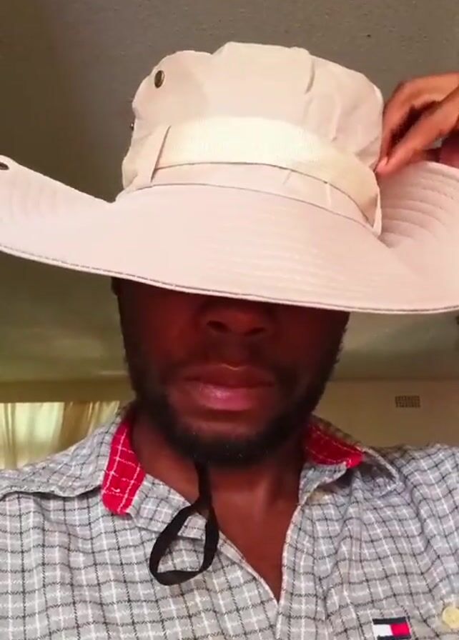 A person is wearing a light-colored hat with a wide brim, pulled down low over their eyes