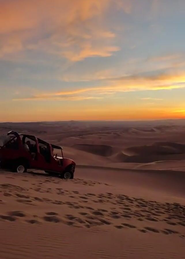 The video captures a desert scene at sunset. Initially, a dune buggy sits on a sand dune, with the sun setting over the desert landscape in the background. As the video progresses, the camera shifts to a red dune buggy. Several people are visible on the dune, including a woman with her hair in a bun who is looking out at the landscape. Some people are sitting on the dune. Footprints are evident in the sand. The sky is colorful with hues of orange, pink, and blue.