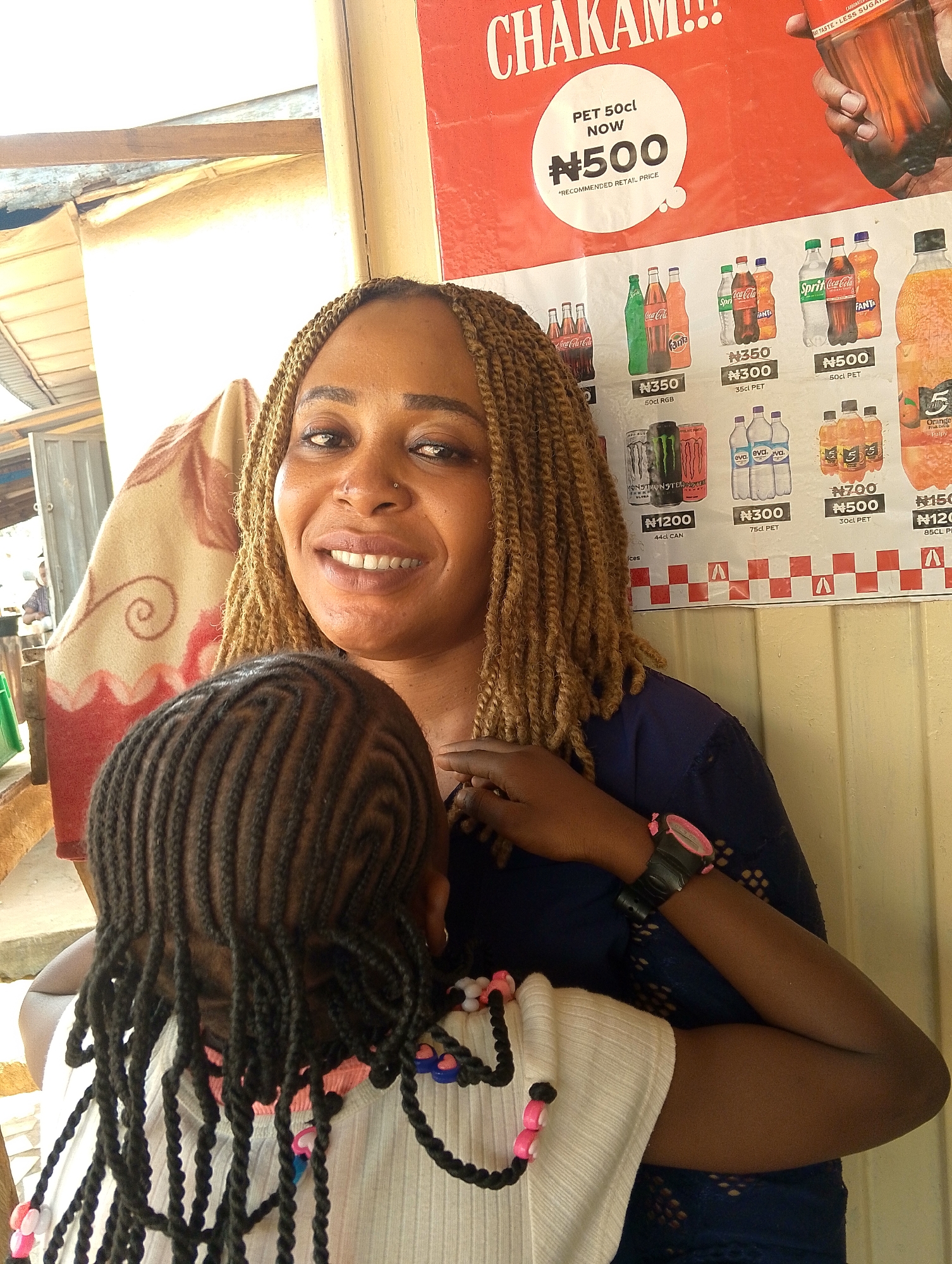 An adult female and a child are depicted in the foreground within Sabon Tasha, Nigeria, against a commercial beverage advertisement poster