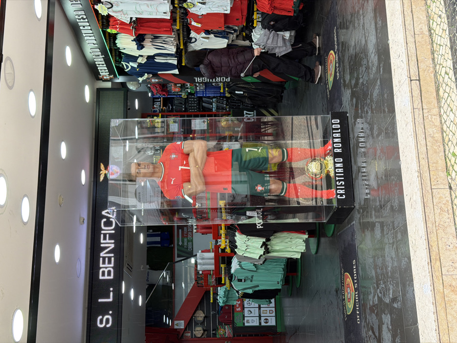 The image depicts the storefront and immediate interior of a sports merchandise store in Lisbon, Portugal, identifiable by the "S