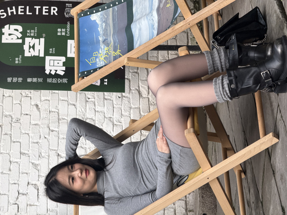 In an outdoor urban setting within Yuzhong District, China, a female subject is depicted seated in a light wooden sling-back deck chair