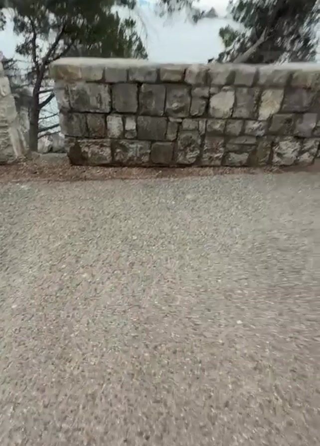 A first-person perspective video shows someone walking along a stone path next to a low stone wall. The wall borders a cliff overlooking a turquoise sea. The path is gray and seems to be made of gravel. The person is wearing a pink hooded sweatshirt and black shoes. Their legs and shorts are briefly visible. The view over the wall reveals a rocky cliffside with some vegetation, leading down to the water. A pine tree with bare branches hangs over the cliff edge. The sea appears calm and clear, with visible rocks under the surface. The sky is overcast.