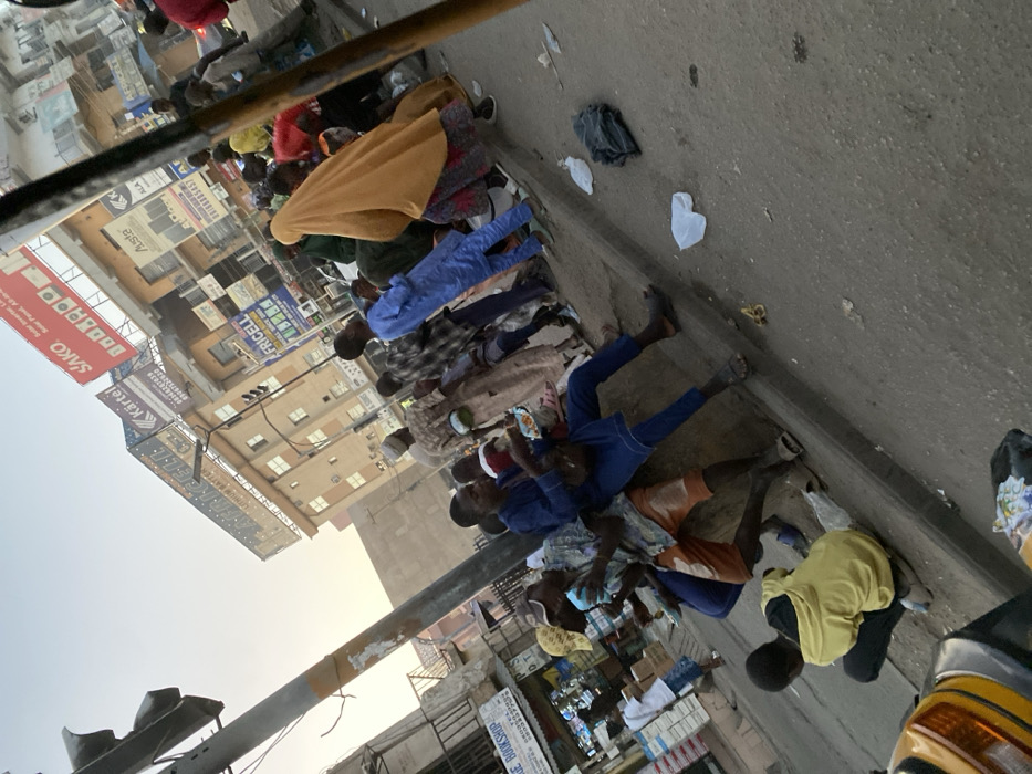 A group of people, likely children or young adults, sit along a curb in an urban street. They are mostly dressed in casual clothing. Some are eating. Trash litters the ground around them. Tall buildings with billboards line the background. The photo is taken from a slightly elevated position, possibly from a vehicle. The image is rotated slightly, with the horizon tilted.