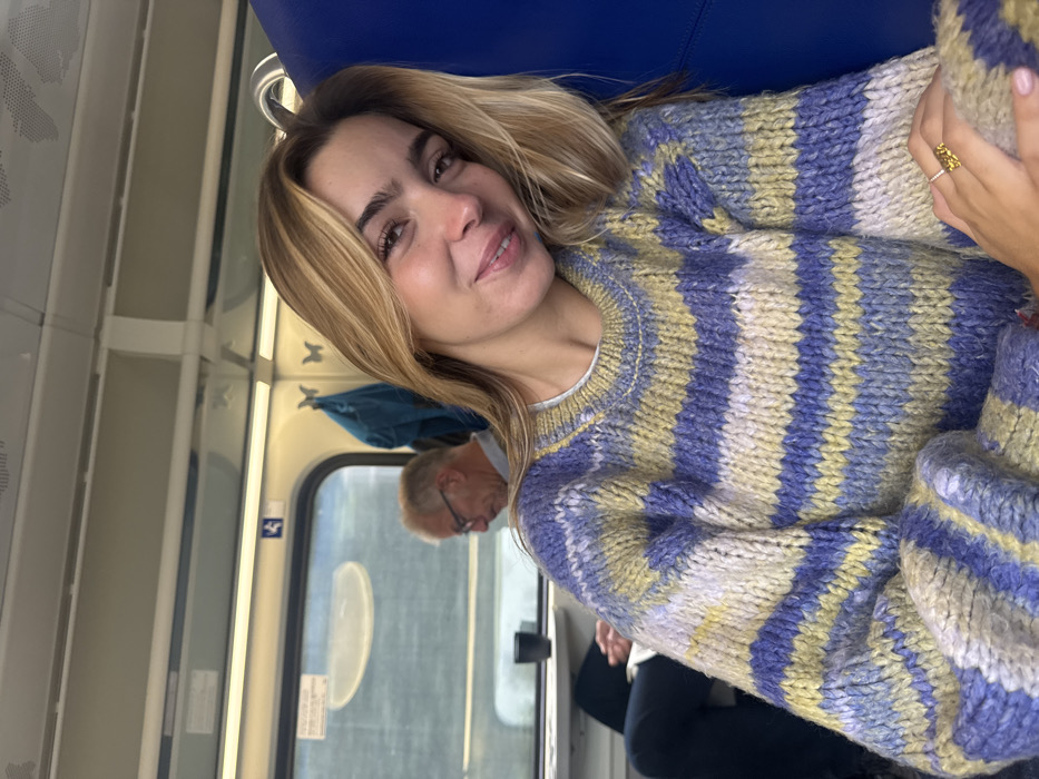 The image displays the interior of a passenger train carriage located in the city of Vught, Netherlands. A young adult female, with long blonde hair and wearing a thick, multi-striped knitted sweater in shades of blue, purple, yellow, and white, occupies the foreground. She is seated, smiling, and looking directly towards the camera. Her right hand, adorned with a gold-colored ring, rests on her left arm. To her right, a portion of a blue upholstered train seat is visible. In the mid-ground, an older male with short grey hair and glasses is seated at a table, viewed through a train window and its reflection. He is looking downwards, appearing to be engaged with an item on the table in front of him. A black cup is visible on the table. Partially obscured under this table, the lower legs of another passenger, clad in dark trousers, are visible. The train interior features light-colored walls and ceiling, overhead luggage racks, and a large window. A blue jacket hangs on a hook above the window, positioned beneath two decorative butterfly-shaped elements. A blue accessibility symbol is also affixed to the wall above the window. The exterior scene visible through the window is blurred, suggesting the train is in motion.