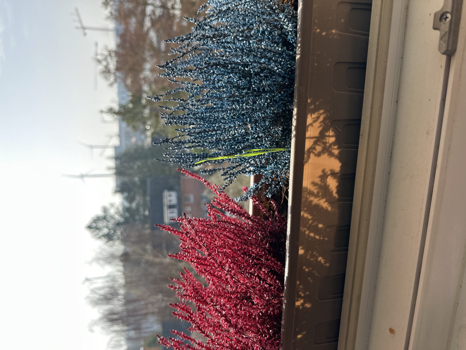 The image depicts an outdoor scene viewed from a window, featuring a planter in the immediate foreground and an urban/industrial landscape in the background under a hazy sky. In the foreground, a rectangular, dark brown plastic window box or planter occupies the bottom half of the frame. It contains two distinct types of plants. On the left, a dense cluster of vibrant reddish-pink, spiky-foliaged plants (likely heather or similar) is visible. To its right, a similar dense cluster of teal or bluish-green spiky plants is present. A single, slender, bright green blade of grass or sprout emerges between the two plant clusters. The planter casts pronounced shadows onto the white window ledge directly beneath it, indicating direct sunlight from the right. The window frame beneath the ledge is white, with some visible grime or dust accumulation and a metallic latch element on the bottom right. The midground is out of focus, showing a residential area characterized by blurred building structures with dark roofs and light-colored facades. At least one building shows multiple white-framed windows. Numerous trees are visible, some appearing bare, indicating a colder season, while others retain some foliage. The far background, also out of focus, reveals several large industrial structures against a bright, hazy sky. Prominently featured are multiple wind turbines with tall, slender towers and large blades; at least three distinct turbines are identifiable. Additionally, several tall construction cranes with lattice structures and extended jibs are visible, primarily towards the right side of the background. The combination of residential buildings, bare trees, distant wind turbines, and active construction cranes suggests a view over a mixed-use urban landscape, characteristic of parts of Hamburg, Germany, particularly looking towards the city's industrial or port areas, such as those found in or around the Wilhelmsburg, Harburg, or Waltershof districts, which feature both residential zones and significant industrial infrastructure and development along the Elbe River.