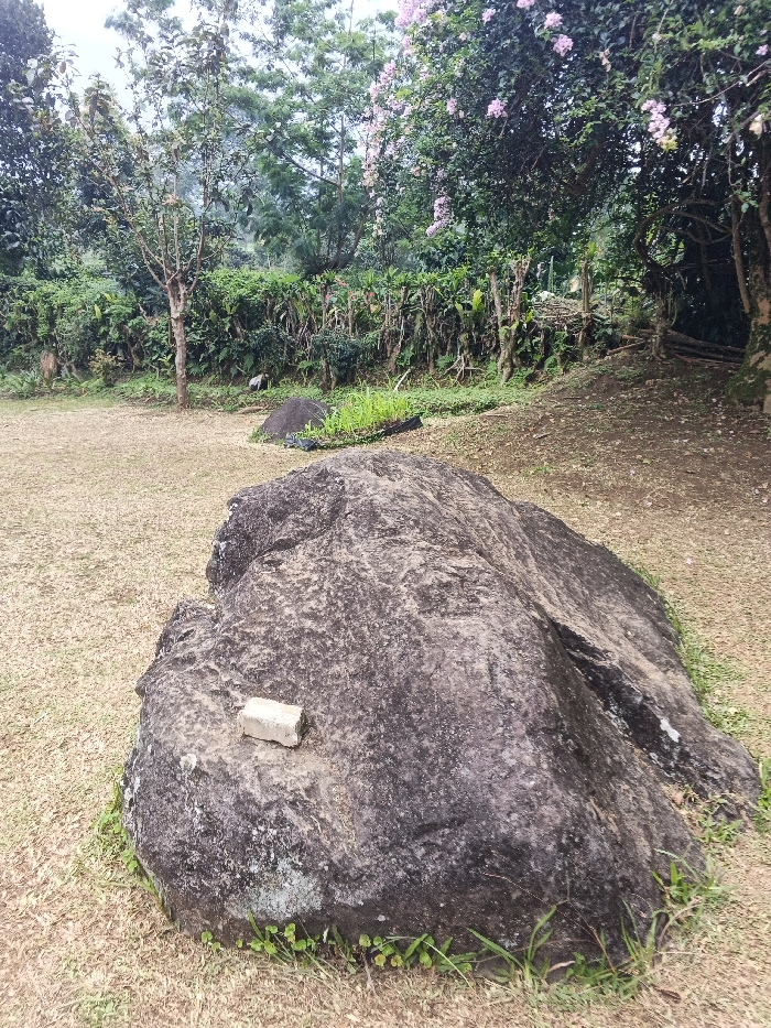 The scene depicts an outdoor, vegetated area in Lokossa, Benin. In the immediate foreground and extending into the mid-ground, a large, dark grey, irregularly shaped rock with a textured, weathered surface dominates the lower right portion of the image. A small, light-colored, rectangular brick rests on the upper surface of this primary rock. The ground surrounding the rock consists of sparse, dry, light brown and green grass. Further into the mid-ground, to the left of the large rock, a smaller, dark, rounded mound is visible with a patch of vibrant green vegetation growing adjacent to it. The background is characterized by dense foliage, including a low, somewhat manicured hedge or row of plants. Behind this, numerous trees with varied green leaves rise, with some on the right exhibiting clusters of light pink or purple blossoms. The lighting is diffused, suggesting an overcast sky or shaded environment. No individuals or specific structures identifying a precise location within the city are present.