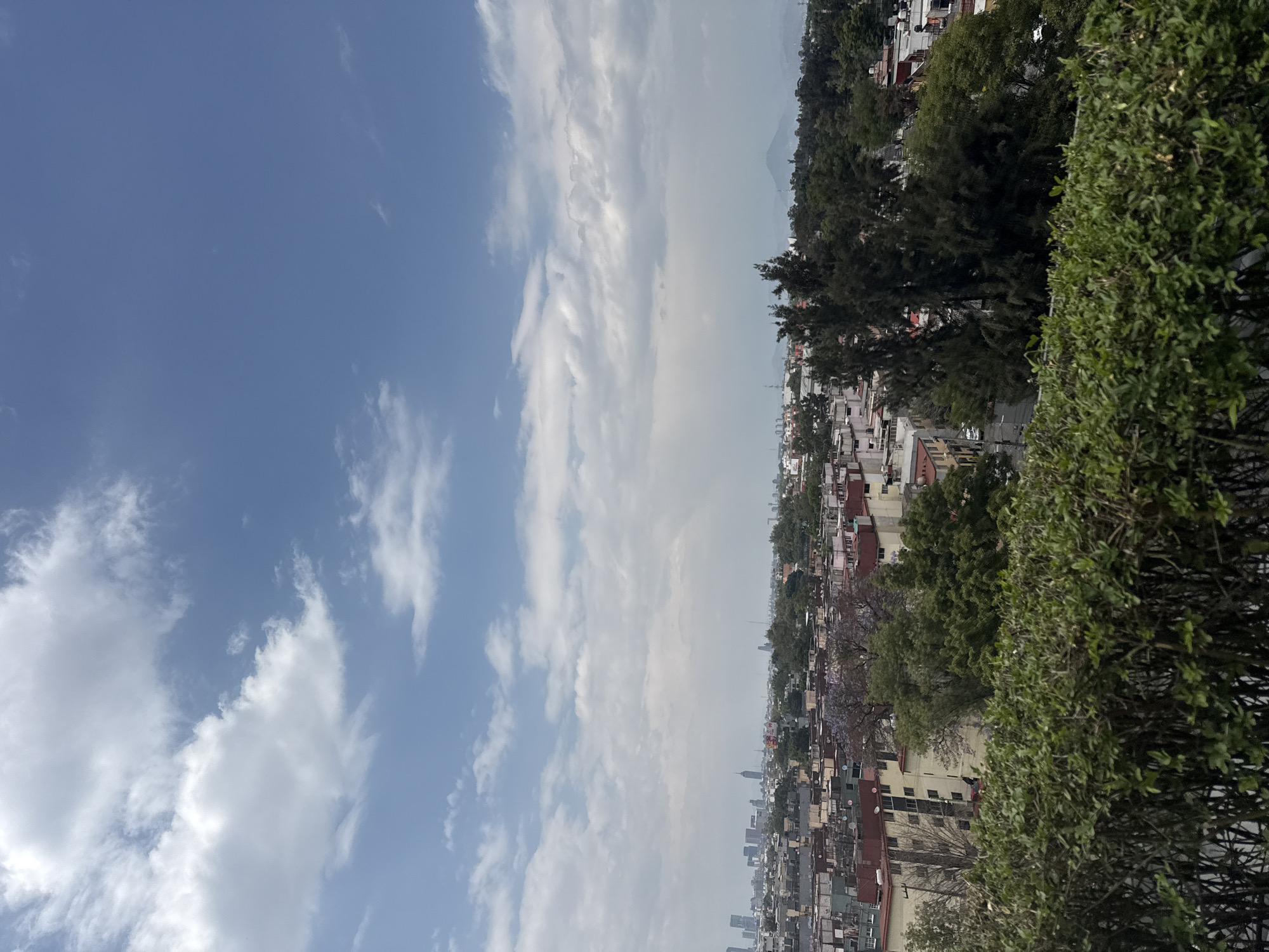 high-angle view of Mexico City. The sky is visible with some clouds, taking up half of the picture. Below the horizon lies a dense cityscape, composed primarily of low-rise buildings, interspersed with mature trees and green vegetation. In the distance, taller buildings of the city center are visible. The foliage in the foreground suggests the vantage point is from an elevated garden or park.