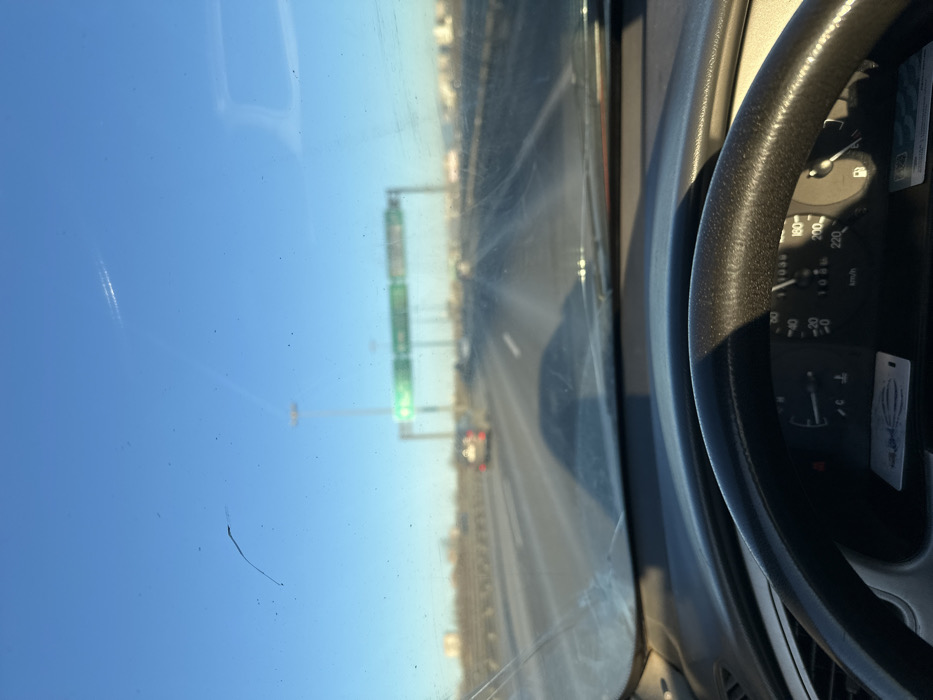 The image depicts a driver's perspective from inside a vehicle traveling on a multi-lane highway in the city of Bugry, Russia. The dirty windshield occupies the upper portion of the frame, exhibiting streaks, smudges, and a prominent crack or scratch originating from the upper left. Strong sunlight from the right causes significant glare across the windshield. In the immediate foreground, the top of a dark, textured steering wheel and a segment of the dashboard are visible. A portion of the instrument cluster is discernible, showing a speedometer calibrated in km/h and a fuel gauge. Beyond the windshield, the highway extends into the distance under a clear blue sky. Traffic is moderate, with several blurred vehicles visible, including a light-colored car in the left lane in the mid-distance. An overhead gantry sign with green panels, providing road information, spans the highway ahead, heavily blurred by distance and glare. Tall, single-pole streetlights are spaced along the highway. Distant urban infrastructure or foliage lines the horizon, also out of focus. No specific individuals are identifiable within the frame. The scene suggests movement along the highway under bright, low-angle sunlight, casting long shadows not directly visible but implied by the light quality.