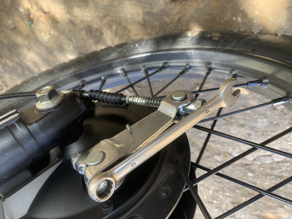 A close-up shows a motorcycle wheel with a brake mechanism being adjusted