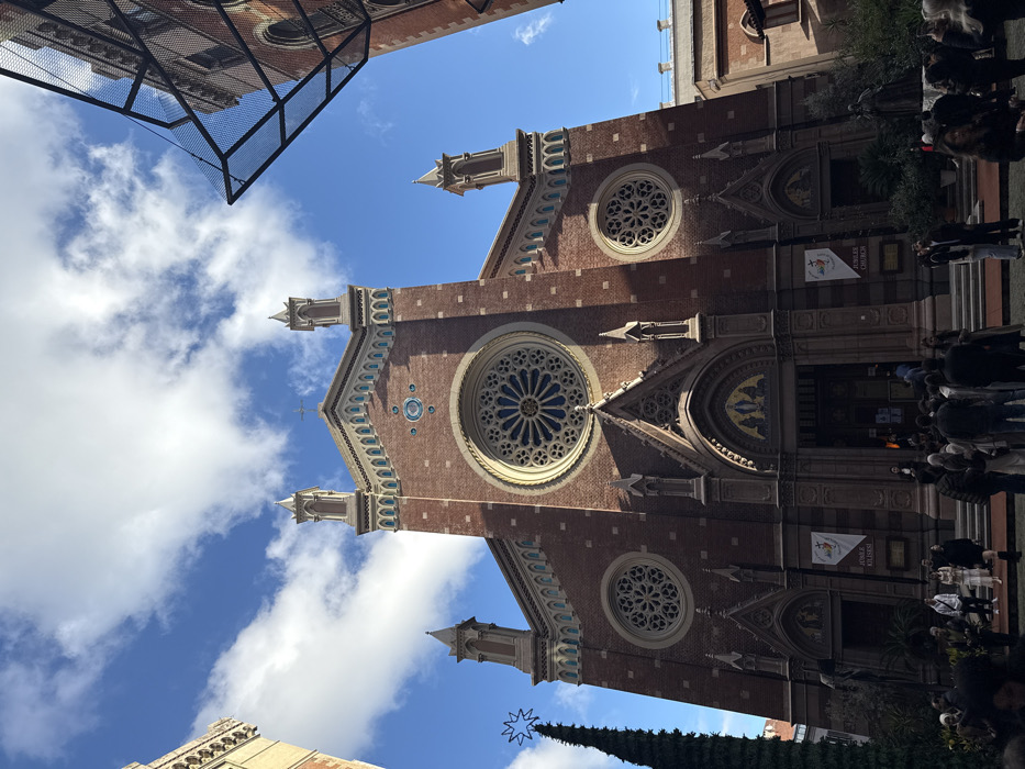 The image captures the St. Anthony of Padua Church (Sent Antuan Kilisesi) on İstiklal Avenue in Beyoğlu, Istanbul, Turkey, under a clear blue sky with scattered white clouds. The church facade, constructed of red brick in a Neo-Gothic style, dominates the central frame. It features a large central rose window above the main entrance and two smaller rose windows flanking it at a lower elevation. The main portal is intricately carved, with a mosaic depicting religious figures above the arched doorway. A banner to the left of the entrance displays "AZİZ ANTOAN KİLİSESİ" (Saint Anthony Church). The roofline is punctuated by multiple spires and turrets, with decorative light blue or teal tiling visible below the eaves and a cross at the highest point. In the foreground, a gathering of approximately 50-70 individuals, mostly adults, are observed standing, walking, and conversing in the paved courtyard directly in front of the church entrance. They are dressed in casual attire. To the left of the church, a tall, slender coniferous tree, possibly a cypress, stands adorned with a star-shaped topper. Two statues on pedestals flank the main entrance. Portions of adjacent buildings are visible on both sides of the church, with a distinct black mesh structure protruding from an edifice on the upper right side of the frame. Sunlight illuminates the scene, creating discernible shadows.
