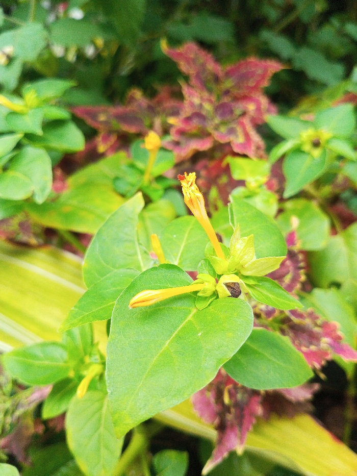 A close-up shows a cluster of four o'clock flower buds among green leaves. One bud has opened, revealing a yellow flower with reddish tips. Nearby is a black seed. In the background, there are other plants with vibrant red and green leaves, creating a colorful backdrop for the delicate yellow flowers in the foreground.